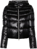 schwarzer Feder-Daunen-Stepp-Design klassischer Kapuzenkragen Druckknopfverschluss vorne Zwei-Wege-Reißverschluss lange Ärmel zwei seitliche Reißverschlusstaschen verkürzter Kordelzugsaum komplett gefüttert Nylon-Daunenjacke