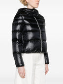 schwarzer Feder-Daunen-Stepp-Design klassischer Kapuzenkragen Druckknopfverschluss vorne Zwei-Wege-Reißverschluss lange Ärmel zwei seitliche Reißverschlusstaschen verkürzter Kordelzugsaum komplett gefüttert Nylon-Daunenjacke