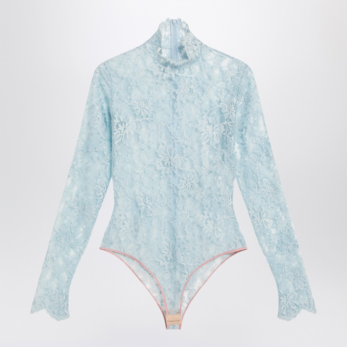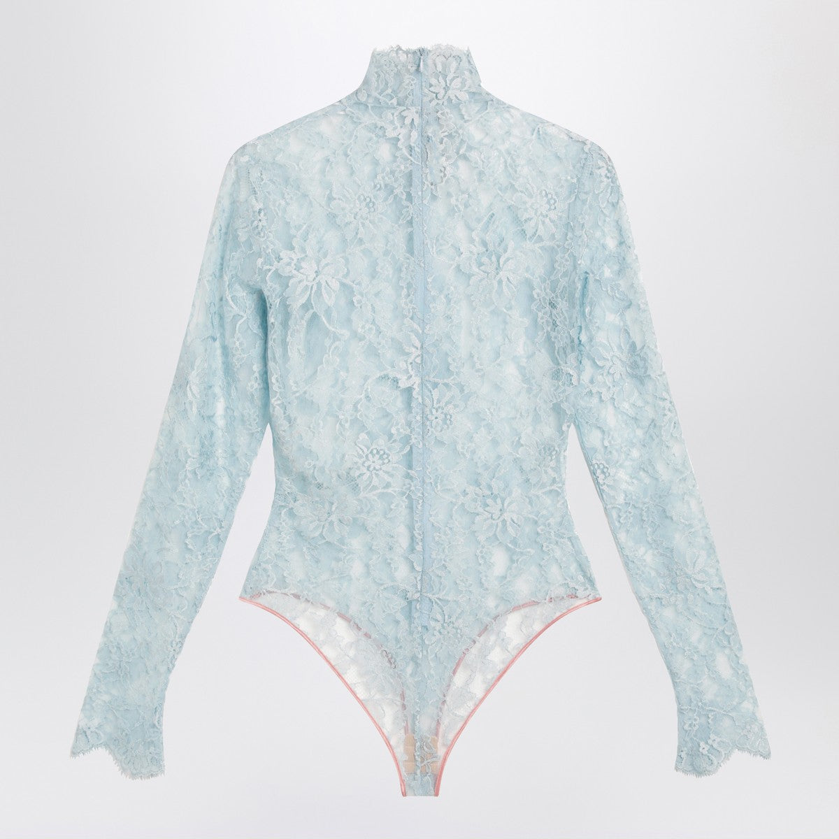 Light blue-grey floral lace bodysuit by Valentino, featuring a high neck, long sleeves, slim fit, and back zip closure. Size and Fit - Model wears size S Model measurements: Height: 178 cm Chest: 83 cm Waist: 63 cm Hips: 91 cm
