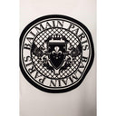 Balmain weißes Baumwoll-Sweatshirt mit Rundhalsausschnitt und kontrastierendem schwarzen Samt-Logoaufdruck, gerippter Kragen, Bündchen und Saum
