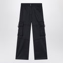 Givenchy black cotton blend trousers, featuring an elasticated waistband with belt loops, front closure with logo plaque, two welt pockets, and two side flap cargo pockets.