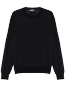 puños y bajo acanalados azul medianoche parche con logo en la parte trasera cuello redondo Suéter de lana y seda con cuello redondo