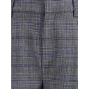 I pantaloni con motivo Prince of Wales di Brunello Cucinelli interpretano l'eleganza classica con un taglio moderno. La chiusura frontale con zip e gancio e i passanti per cintura in vita garantiscono una vestibilità su misura, mentre le tasche a filetto laterali e posteriori aggiungono funzionalità. Il risvolto sul fondo e la gamba larga cropped conferiscono al capo un tocco contemporaneo, perfetto per uno stile sofisticato ma casual.
