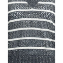 Il gilet a righe di Brunello Cucinelli è un capo sofisticato che unisce artigianalità e dettagli raffinati. Realizzato con una trama larga, si distingue per lo scollo a V e i bordi a costine, che donano struttura e definizione al modello. Il motivo a righe è impreziosito da micro paillettes applicate all-over, che catturano la luce con discrezione e aggiungono un tocco di luminosa eleganza.