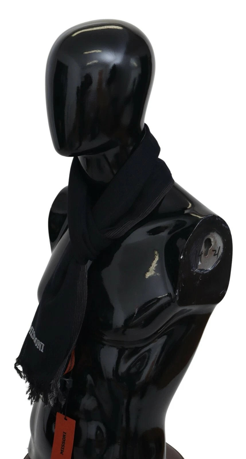 Black Striped Wool Unisex Neck Wrap Fringes Logo Scarf