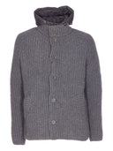 그레이 골지 니트 앞단추 여밈 탈부착 가능한 이너 베스트 웰트 포켓 후드 넥 울 니트 재킷