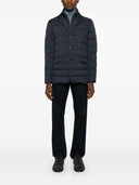 design acolchoado com penas de ganso azul marinho design isolante detalhes em camadas painéis destacáveis gola com recorte mangas longas bolso de peito com aba dois bolsos frontais com aba bainha reta bolso interno embutido forro completo fechamento frontal com botões e zíper La Giacca jaqueta de nylon com penas